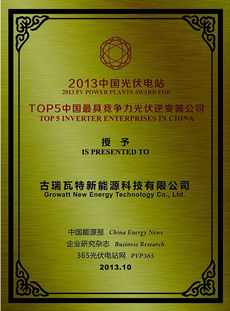 索比光伏网讯: 10月22日, “2013中国光伏电站年度颁奖典礼”在北京隆重召开,凭借前三季度在全球市场的优异表现,古瑞瓦特再获业界同仁的一致认可,荣膺“TOP5中国最具竞争力光伏逆变器公司”称号。