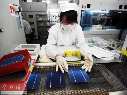 资料图:工作人员对生产线上的太阳能电池板进行筛选监测。
