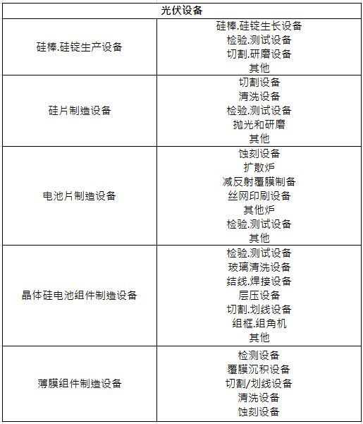 索比光伏网讯:光伏设备指光伏制造型企业用于生产原料、电池组件、零部件等产品中使用的,并在反复使用中基本保持原有实物形态和功能的机器设备。