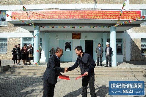 当地时间中午12点,吉尔吉斯斯坦国家汉办孔子学院院长苏柏·阿那别克、特变电工驻吉尔吉斯斯坦办事处主任木沙江·马克莱克、特变电工吉尔吉斯现场项目经理张建民应邀出席了捐赠仪式,出席仪式的还有吉尔吉斯斯坦祖国党领袖杰克巴耶夫、中华人民共和国驻奥什领事馆领事米丽娜、阿克曼村学校校长扎米尔等。此次捐助的物资为专程从中国运去的崭新的电脑、电脑桌、电子黑板、投影仪,餐用桌椅和教师办公室的文件柜、电冰箱等。 继特变电工承建吉尔吉斯南部电网改善项目竣工投运后,特变电工又承担了达特卡—克明500kV输变电工程。该项目建成后将极大地改善吉尔吉斯斯坦电网结构,彻底解决北部居民用电、工业用电短缺的现状,带动吉尔吉斯斯坦经济快速发展,创造良好的社会效益。在为当地建设电力项目,造福一方百姓的同时,特变电工积极履行跨国企业的社会责任,为当地村民修路架桥,捐资助学,塑造了中国企业的良好形象,树立了中吉两国人民的友谊丰碑。
