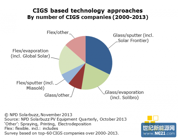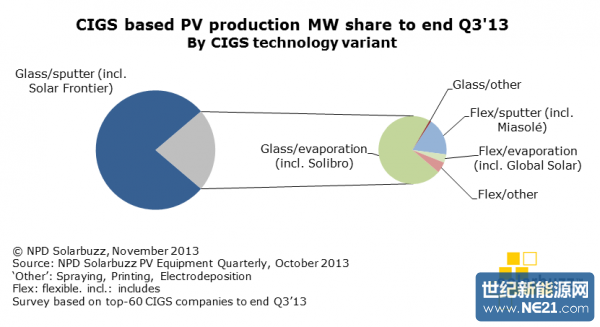 图二将六个技术类型中的集体CIGS产能进行了细分。玻璃/溅射技术类型占到了2013年第三季度CIGS技术兆瓦产能中的78%,而在这一主流市场份额中,Solar Frontier公司生产了约92%的玻璃/溅射CIGS产品。柔性技术类别下的超过20家CIGS公司的联合产能仅占到了占到了CIGS迄今为止产出的6%。