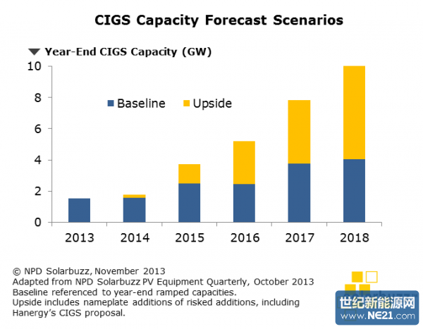 在基线数据中,CIGS的产能将由2013年底的1.54GW增长是2018年底的约4GW。但是,在考虑到具有风险的扩张后(其中汉能占了绝大部分比例),上扬数据所显示的增长数据则是该数字的两倍,达10.8GW。