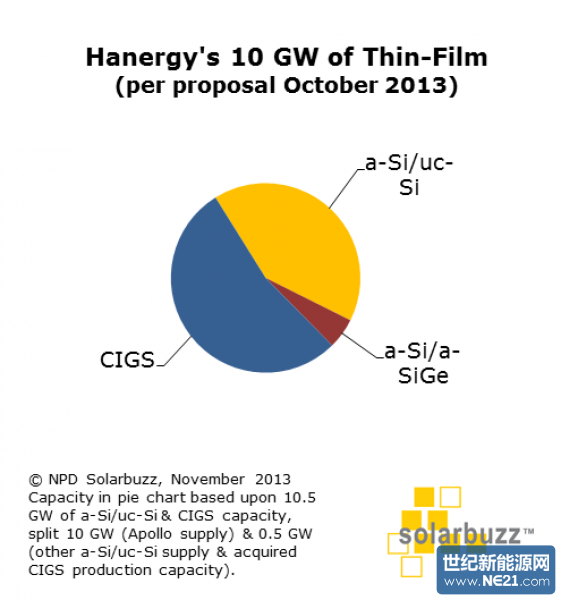因此,汉能计划中的非晶硅和CIGS总量将使得其薄膜产品产能达到10GW。事实上,相关计划中对公司在2010年和2011年间公布的原始(并曾经过修订)框架合约内容(基于不同的非晶硅吸收类型能力)进行了再分配,形成新的a-Si/uc-Si、a-Si/a-SiGe和CIGS的组合。