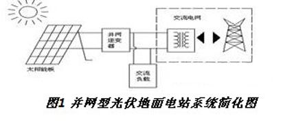 太阳能光伏发电系统有很多类型,这里以太阳能光伏并网大型地面电站发电系统为例进行介绍。光伏地面电站发电系统简化后如图1所示,由太阳能电池阵列,并网逆变器,并网保护装置,以及连接这些设备的布线及汇流箱,安装在交流侧的电表,升压变压器等构成。太阳能电池产生直流电,直流电通过并网逆变器转换为交流电后并入电网,可以与电力公司提供的交流电一起使用。