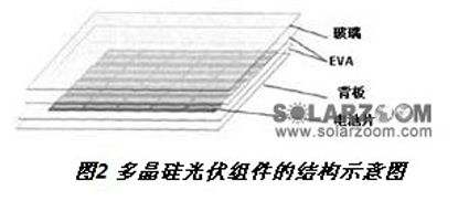 多晶硅光伏组件是由玻璃、EVA、电池片、背板和电池板等组成(如图2所示)。由于多晶硅组件价格合理且性能良好,所以在市场上占有比较大的份额。
