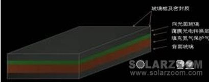 硅材料目前是太阳能电池的主导材料,而非晶硅太阳能电池使用的硅材料约为晶硅电池的百分之一,这就大大降低了原材料成本。双结硅基薄膜组件是由玻璃基板,透明导电层,半导体层等构成(如图3所示)。双结硅基薄膜组件可应用于建筑整合式应用,屋顶,以及大型地面电站。目前,双结硅基薄膜组件的实验室转换效率以及达到15%,量产后的效率约在10%。