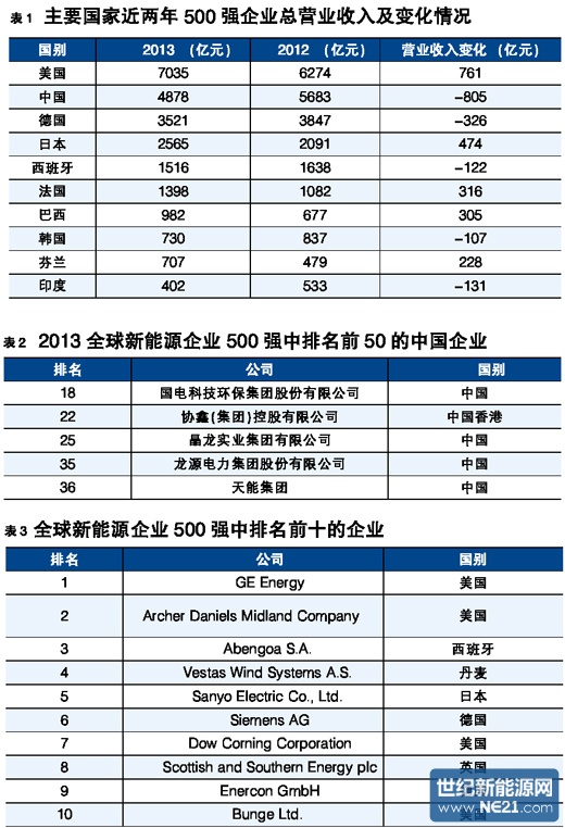 2012年,全球经济特别是发达国家的经济持续低迷,新能源领域的贸易保护主义愈演愈烈,新能源产业发展受到极大冲击,步入整合期,新能源企业破产、重组的案例层出不穷。受此影响,2013 “全球新能源企业500强”(以下简称“500”强)的榜单发生了较大的变化,呈现出以下特点: