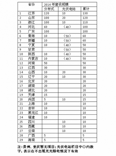 各省级能源主管部门对2014年本地区光伏电站和分布式光伏发电规模安排提出意见并填写规模调整建议表,并详细说明理由和保障措施。国家能源局要求各省(市、区)能源主管部门填写上述信息后再2013年11月10日前报至国家能源局,以及使将2013年投产项目纳入国家可再生能源发展基金补贴目录并合理安排2014年补贴资金规模。