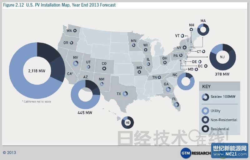 2013年美国建成的光伏发电系统(出处:Solar Energy Industries Association)