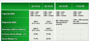 2013年第三季度内部硅片、太阳能电池和太阳能组件生产的内部毛利率为21%,而2013年第二季度为18.3%,2012年第三季度为12.6%。