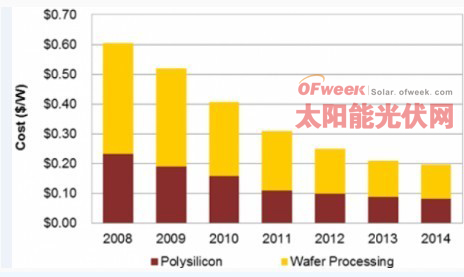 根据NPDSolarbuzz分析,一级一体化多晶硅和光伏硅片制造商的制造成本有望在2014年创历史新低,达到每瓦0.20美元。