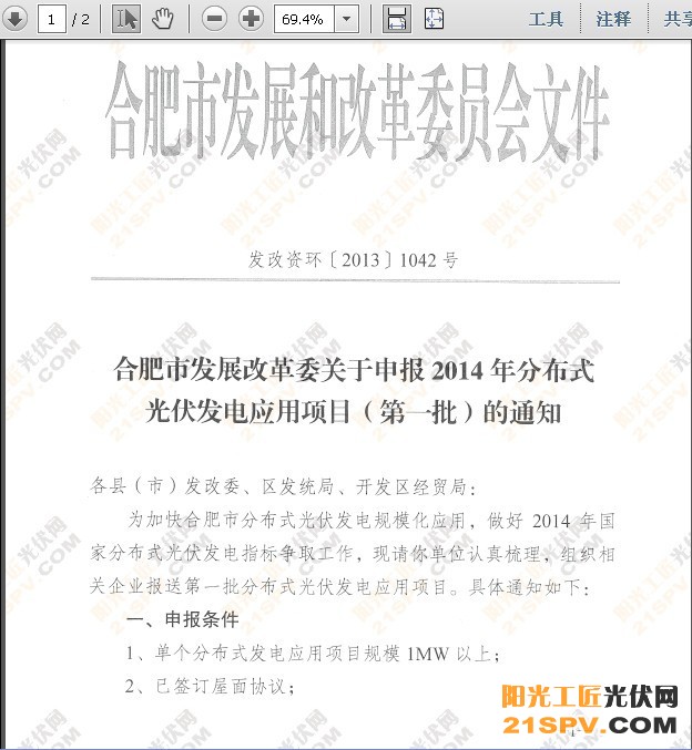 合肥市发展改革委关于申报2014年分布式光伏发电应用项目(第一批)的通知
