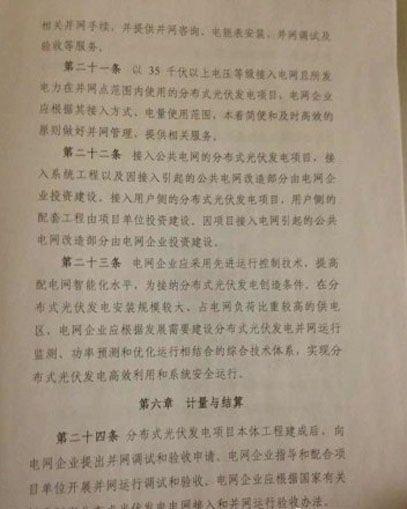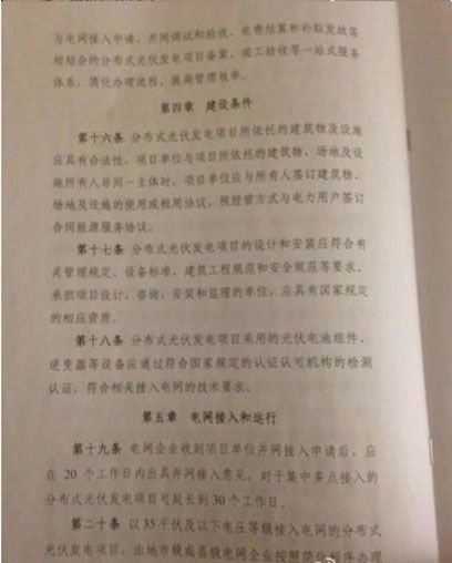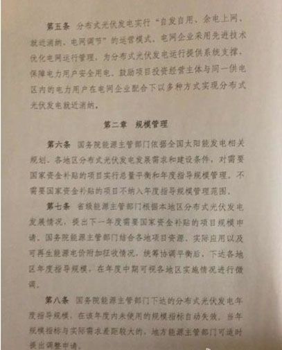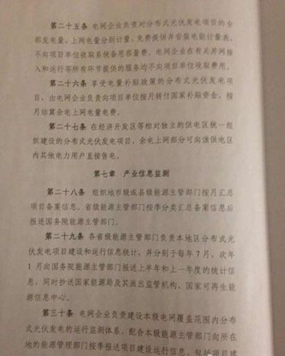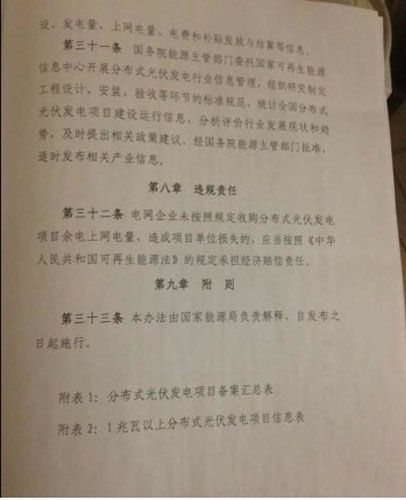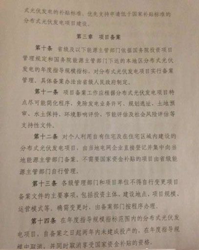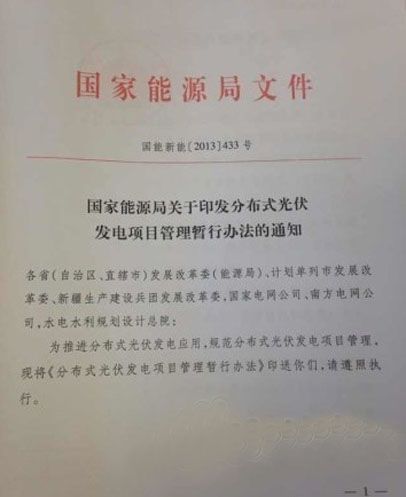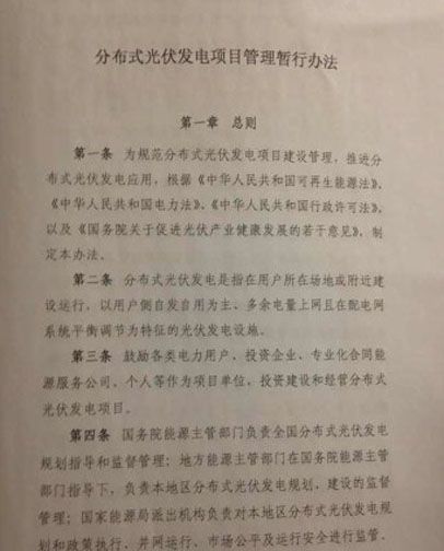 索比光伏网讯:今天上午,记者从英利公司获悉,国家能源局已于11月18日发布《关于分布式光伏发电项目管理暂行办法的通知》,涉及总则、规模管理、项目备案、建设条件、电网接入和运行、计量与结算、产业信息监测及违规责任等细则。业内盼望已久的分布式又一利好政策正式落地。