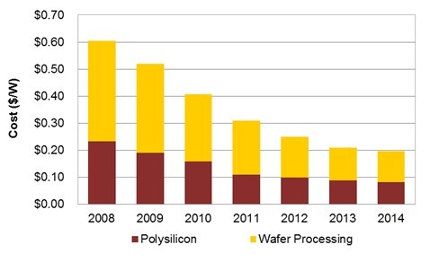 根据NPDSolarbuzz最新研究报告,一线垂直一体化太阳能光伏硅片厂商预计将于2014年将硅片平均生产成本再降6%,达到创纪录的$0.20/瓦。而自2008年以来,太阳能光伏硅片的生产成本(含硅料及硅片)每年下降16%以上。