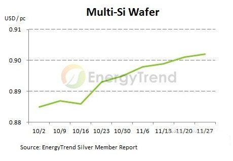另一方面,供需吃紧的状况也有利矽晶圆业者寻求更好的交易条件。根据EnergyTrend的了解,自十月下旬起,矽晶圆业者逐步调涨多晶矽晶圆的价格,这一个月以来部分业者的涨幅已到达5%,而展望十二月的价格,矽晶圆业者仍有机会持续调涨,除此之外,预估2014年第一季矽晶圆供需市场仍旧吃紧,部分业者考虑重启短期合约交易机制,然而付款条件、计价方式、与客户接受程度仍是决定此一机制能否付诸实施的关键因素。
