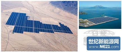 | 美国第一太阳能供应太阳能电池的加利福尼亚州发电站(左)。发电输出功率为55万千瓦,属于全球最大级别。日本国内最大级别、输出功率为7万千瓦的鹿儿岛市七岛太阳能发电站(右)。 |