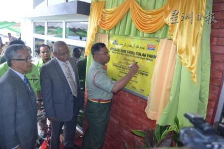 首长依德利斯哈伦为太阳能园主持揭幕仪式,左一和二为峇达鲁丁和州行政议员末尤诺斯