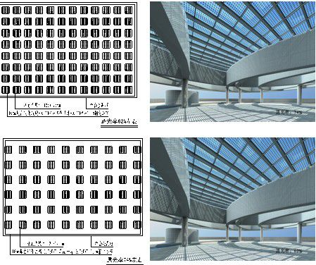分析一:根据该项目采光顶的展开面积及建筑位置,建筑师及业主均认为采用62%透光率的电池组件排列比采用74%透光率的电池组件排列更均称,比较见下图 4。