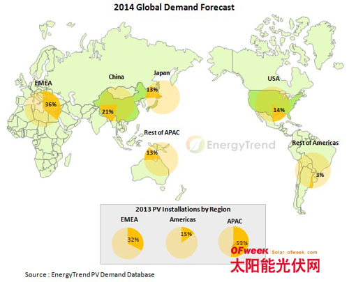 全球市场研究机构TrendForce旗下新能源事业处EnergyTrend表示,2013年全球太阳能市场需求逐季叠高,并网量如年初所预测落在31.5GW,实际需求量受到日本与中国市场预先拉货安装的力道优于预期带动,较年初所预测的33GW提高到35.8GW,其中欧(含中东与非洲)、美、亚的需求量各别占比为32%、15%、53%。EnergyTrend研究经理黄公晖表示,2014年市场需求将延续2013年下半年态势,中国、日本、美国依旧是前三大市场,合计占比达全球约50%。综观全年,2014年下半年需求仍旧会优于上半年,全年市场需求量会落在42GW左右,较2013年成长17%。