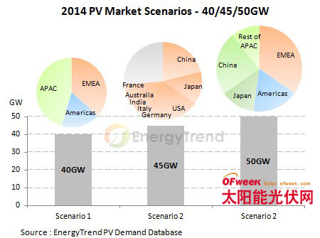 若要达到45GW,全球需有超过8个国家的需求量超过1GW大关,同时各区域的新兴市场也都在政策的支持下,在2014年就完全展现出成长的动力,全球的需求量才可能一举冲过45GW,同时中国的需求量也必须达到9.5GW以上,甚至成为单一年度国家需求首度突破10GW的巨大市场。若市场发展呈现极度乐观,中国的需求量达到12GW、日本6.5GW、美洲8.7GW,并且欧(含中东与非洲)也达到17G的基础下,才有可能创下50GW需求量。EnergyTrend认为这样的发展性很低,如果一旦发生,太阳能产业又要进入前些年涨价的态势。