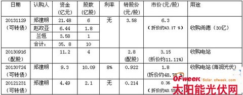 自从去年底资本玩家郑建明强势入主壳公司顺风光电以来,先后进行了四次融资,三次为可转债,一次为配股,总共融资61.79亿,融资公告前股价均出现暴涨,转股价一般都为公告当日市价的5-6折,最高时市值近160亿,最新市值为129亿,全部转股后(45.76亿股)市值为275亿。郑建明累计投入39亿,若所持转债全部转股后,所持股份市值189亿,资产增值150亿。虽然郑建明这一业绩不及尚德施正荣,赛维LDK彭小峰曾创下的辉煌,但对于处在艰难复苏的光伏产业中还是十分炫目的。