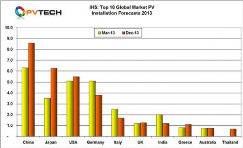 有趣的是,IHS日前对其2013年区域预测做出重大修改,不同于在2013年三月PVFabManagersForum上揭晓的十大市场国家分解。