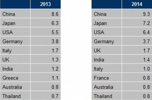 IHS:2013和2014年十大光伏市场。2014年中国、日本、美国和德国再次在排名上领先