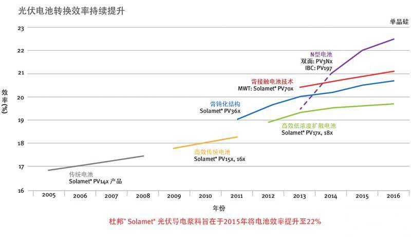 索比光伏网讯:杜邦Solamet导电浆料 协助提升光伏电池效率。据悉,从Solamet® PV17到PV18x系列, Solamet® 导电浆料持续为电池效率树立标准。具体的目标是在2015年协助业界达到22%的电池效率。惟有杜邦™ Solamet® 结合独家专利的碲科技(Tellurium technology)与LDE(低表面浓度扩散)电池设计,为今日光伏行业树立标准。