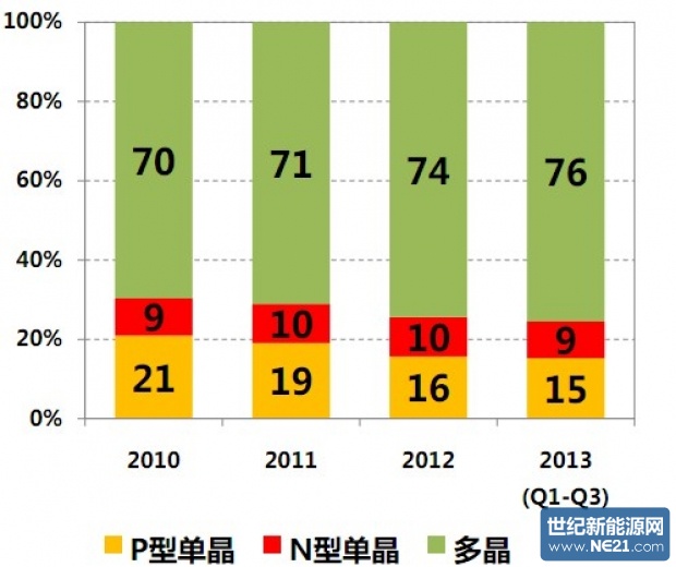 根据Solarbuzz分析,2010年至今多晶份额加速扩张,主要光伏组件厂商70%选择多晶技术路线,其次为P型单晶技术以及N型单晶,这种趋势在2011年、2012年得到延续,选择多晶的企业呈现继续上升的趋势,到2013年前三个季度已经达到76%。