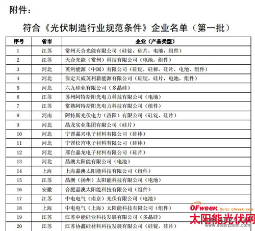 工信部公告称,第一批名单是按照《国务院关于促进光伏产业健康发展的若干意见》的要求,根据《光伏制造行业规范条件》及《光伏制造行业规范公告管理暂行办法》,经企业申报、省级工业和信息化主管部门核实推荐、专家复核、网上公示及现场抽检的结果。