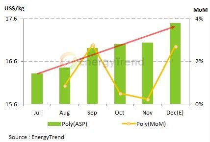 EnergyTrend研究经理胥嘉政指出,多晶硅价格第二季微幅下滑后,2013年下半年随即一路向上,根据EnergyTrend的资料显示,自七月多晶硅价格来到近期的相对低点US$16.32/kg后,自此价格从未跌破US$16.4/kg的价位,而第四季多晶硅价格更是站上US$17.0/kg的关卡,年底现货市场的平均交易价格已经逼近US$18.0/kg。从月平均价格来看,2013年下半年多晶硅现货价格涨幅达7.2%,十二月的月均价已来到US$17.5/kg的水准,2014年一月平均价位上看US$19.0/kg到US$20.0/kg之间。