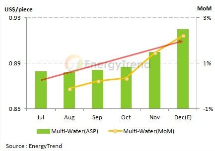 另一方面,由于第四季多晶硅交易价格已站上US$17.0/kg,加上多晶硅片的需求持续攀升,主要业者的产能维持满载,替价格调涨创造有利的条件。除此之外,高效多晶硅片的市场已经出现供不应求的状况,EnergyTrend调查,十二月台系相关业者已全数向外寻找委外代工的产能,以应付持续涌入的需求。经历一段准备期后,硅片业也于第四季开始调整价格,2014年一月的平均价格上看US$0.98/piece到US$1.02/piece之间。