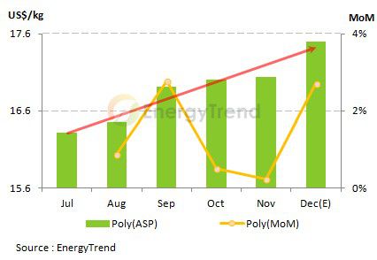 EnergyTrend研究经理胥嘉政指出,多晶硅价格第二季微幅下滑后,2013年下半年随即一路向上,根据EnergyTrend的资料显示,自七月多晶硅价格来到近期的相对低点US$16.32/kg后,自此价格从未跌破US$16.4/kg的价位,而第四季多晶硅价格更是站上US$17.0 /kg的关卡,年底现货市场的平均交易价格已经逼近US$18.0/kg。从月平均价格来看,2013年下半年多晶硅现货价格涨幅达7.2%,十二月的月均价已来到US$17.5/kg的水准,2014年一月平均价位上看US$19.0/kg到US$20.0/kg之间。