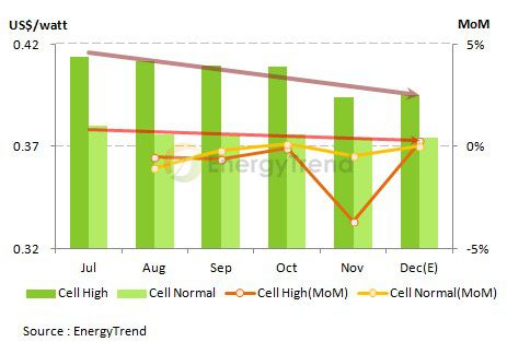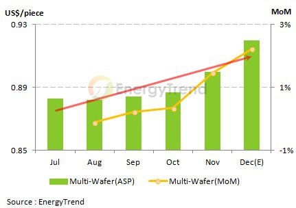 另一方面,由于第四季多晶硅交易价格已站上US$17.0/kg,加上多晶硅片的需求持续攀升,主要业者的产能维持满载,替价格调涨创造有利的条 件。除此之外,高效多晶硅片的市场已经出现供不应求的状况,EnergyTrend调查,十二月台系相关业者已全数向外寻找委外代工的产能,以应付持续 涌入的需求。经历一段准备期后,硅片业也于第四季开始调整价格,2014年一月的平均价格上看US$0.98/piece到US$1.02/piece 之间。