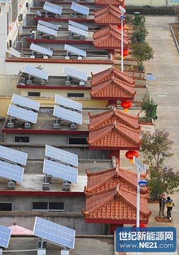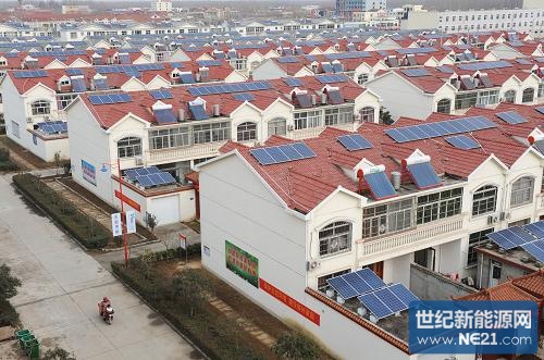 这是1月8日拍摄的农民住宅小区连片屋顶 “光伏发电村”。当日,随着最后一户村民家的光伏发电设备并网成功,江苏省首个农民住宅小区连片屋顶“光伏发电村”在连云港市东海县青湖镇青南村并入国家电网,正式开始发电。青南村屋顶光伏发电项目由江苏省经信委投资建设,129户居民的屋顶被安装1556块多晶硅太阳能组件,采用自发自用、余电上网的方式,预计所发电量的80%供居民使用,剩余20%由国家电网公司收购,年发电量可达39.33万千瓦时。与燃煤发电相比,该光伏发电项目每年可以节省标准煤128吨,减少二氧化碳排放341吨。