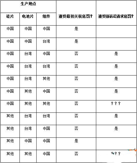 最不济,SolarWorld也将谋求对台湾太阳能电池片征收进口关税,此举将根除绝大多数中国供应商目前利用的台湾来料加工策略。另外,为了阻止中国制造商简单地将电池片来料加工转移到其他国家,这次申请还寻求对使用中国硅锭或硅片的组件征收关税,不管电池片在何处制造。这里有一个令人感到困惑的地方:上段话最后一句没有清楚说明,是否组件本身必须在中国境内组装而成才会受到关税制裁。为了理清思路,下表是我们对这次关税申请的解读: