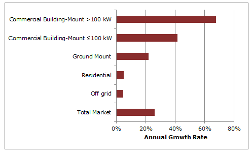 装机规模在100KW以下的小型商业应用预计将同比增长约40%,而大型商业项目的年增长率将达到70%,与地面光伏系统相比,增长率分别达到两倍和三倍。
