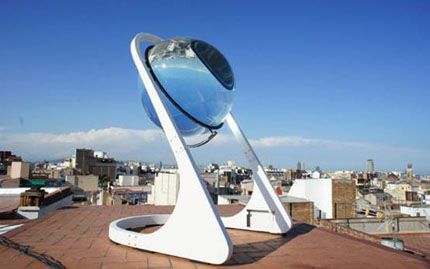 这是去年由德国设计师AndréBroessel推出的球形玻璃太阳能发电机概念,这个灵感是由他女儿的玩具弹珠激发出来的。发电机采用了球形透镜聚焦太阳光到一块很小的光伏面板上,另外还配有一个独特的双轴跟踪系统可以追踪太阳的动向。