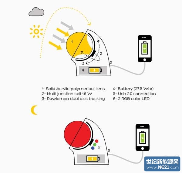 据设计师称,设备上透明的球体可以搜集分散的能量,提升了能量效率,这是传统设备无法做到的,且它比传统平坦固定的设备能应用在更多的地点中。另外,通过集中太阳能到一小块区域,设备减少了太阳能电池的数量,只需要传统面板的1%即可。