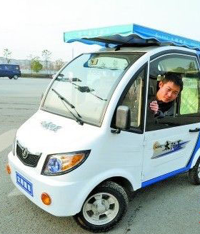 车主黄建章告诉我们,这辆车是他花1.6万元在砂子岭买的,车子是纯电力车,奥秘全在车顶的太阳能电池板上,在太阳照射下,这车可以边走边给蓄电池充电,冬天太阳弱一点,但晴天跑上百公里没点问题。