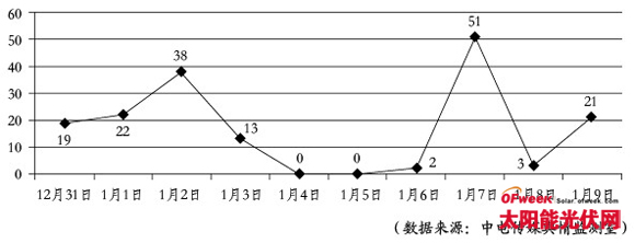 解析:2013年12月31日,“美国拟对台湾光伏产品实施双反策略”的报道开始在网络传播,消息源于机电商会。1月1日,《东方早报》的《中美光伏贸易摩擦新动向:拟堵台湾代工电池通道》转载较多。1月2日,《上海证券报》的《美拟堵光伏代工双反漏洞我国光伏出口再遇挑战》报道转载量较大。1月3日,中国机电产品进出口商会发出的《关于报名参加美国拟对我光伏产品进行双反调查行业损害抗辩通知》出现在网络上。1月7日,《21世纪经济报道》的《美国再提光伏“双反” 机电商会称将“共同抗辩”》报道影响较大。1月9日,《中国经济时报》的《美国企业再度发难 中国光伏业急应对》关注较高。