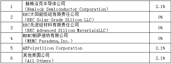 在补贴调查期内,原产于REC太阳能级硅有限责任公司的进口被调查产品从价补贴率为0.2%,属于微量补贴;原产于REC先进硅材料有限责任公司和MEMC帕萨迪纳有限公司的进口被调查产品均未获得补贴。原产于此三家公司的进口被调查产品适用的反补贴税税率为0%。