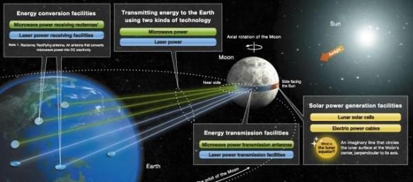 由于月球赤道能获得稳定量的太阳能,清水建设株式会社提议在月球赤道上修建发电设施,使用设施上的太阳能电池将阳光转化为电。清水建设株式会社网站上关于该项目的细节信息显示,此时,电就能通过电缆传至月球面对地球的那一面,然后转化为微波和激光电力传至地球。