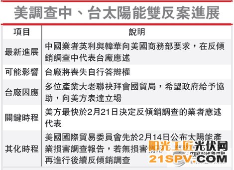 美国商务部已启动对陆、台太阳能厂的反倾销调查,美国国际贸易委员会(ITC)预定于2月14日宣布陆、台业者对美太阳能产业损害调查的结果。业界依照过往经验,推估台厂几乎难以避免后续的反倾销调查。