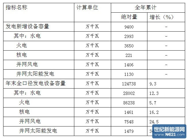 根据中电联快报统计,2013年全国发电装机实现平稳较快发展,全年新增发电装机9400万千瓦,其中,水电新增2993万千瓦,火电3650万千瓦,核电221万千瓦,并网风电1406万千瓦,并网太阳能发电1130万千瓦。