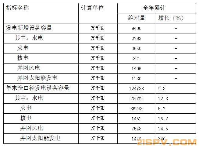 来源:国家能源局发布时间:2014-02-10 23:59:59 根据中电联快报统计,2013年全国发电装机实现平稳较快发展,全年新增发电装机9400万千瓦,其中,水电新增2993万千瓦,火电3650万千瓦,核电221万千瓦,并网风电1406万千瓦,并网太阳能发电1130万千瓦。