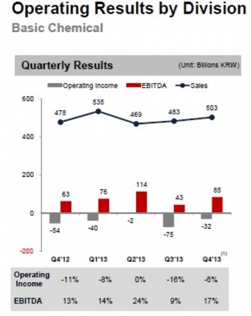 销售额的提高及稳定的价格致使BasicChemical部门运营亏损创纪录为320亿韩元(3000万美元),而2013年第三季度运营亏损为751亿韩元(7040万美元)。