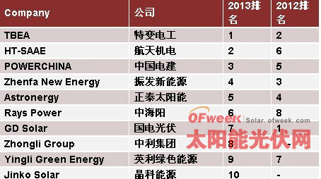 中国太阳能光伏项目承包商的竞争在2013年非常激烈,在2012年排名前十的项目承包商的命运各不相同,最明显的变化之一是特变电工跃居榜首,全年的项目承包量大幅领先其他企业。根据NPDSolarbuzz的调研,考虑到发电送出通道的未来潜力,在2014年新疆有望成为中国最大的光伏项目市场,而作为扎根新疆的新能源企业,特变电工无疑将进一步受益于中国光伏市场的蓬勃发展。