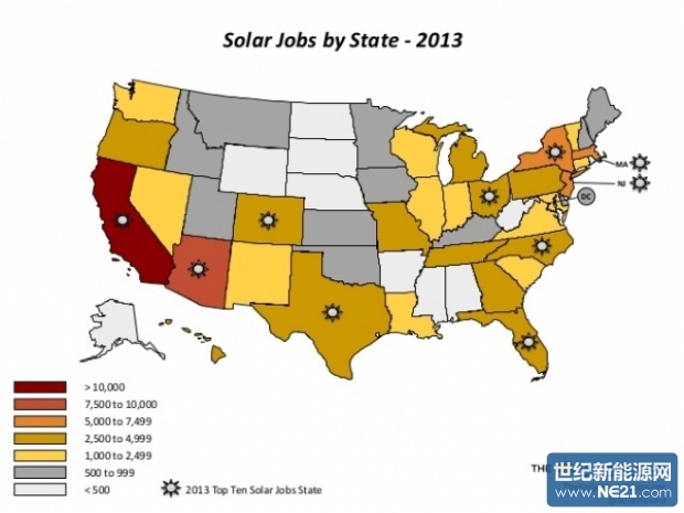 2013年该州新增3500个就业岗位,到年底总计达47233个。根据该基金会,加州太阳能员工的60%被界定为安装商,制造业占员工的30%,项目开发约占就业岗位的6%,其余的属于其他范围,包括学术界和非营利组织。