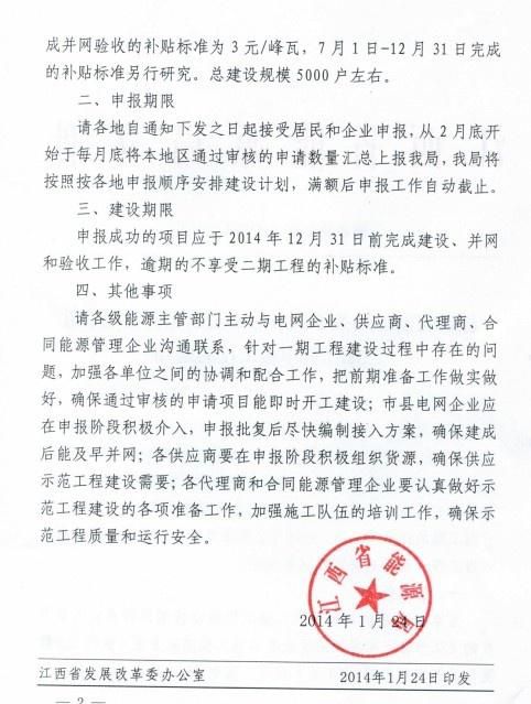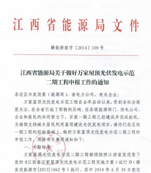 索比光伏网讯:近日,江西省能源局下发《关于做好万家屋顶光伏发电示范二期工程申报工作的通知》。据悉,江西省2014年6月30日完成并网验收给予3元/W补贴,7月1日-12月31日完成补贴另行研究,总规模5000户左右。